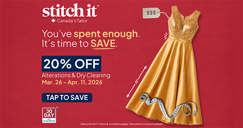 Looking to get the perfect fit for prom? Stitch It has you covered! Save 20% off alterations & dry cleaning from March 26th until April 11th. You've spend enough, it's time to save! Visit us today. Conditions apply. See stitchit.com/deals for details.