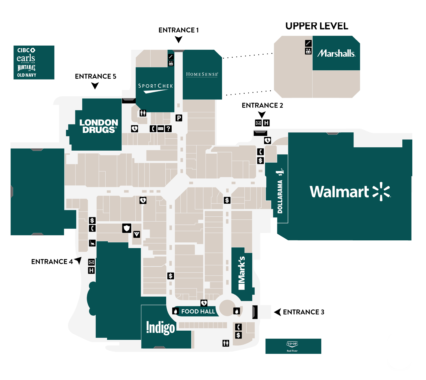 Featuring over 160 premium shops and services, London Drugs, HomeSense, Marshall’s, Indigo, SilverCity, Mark's, and Walmart.